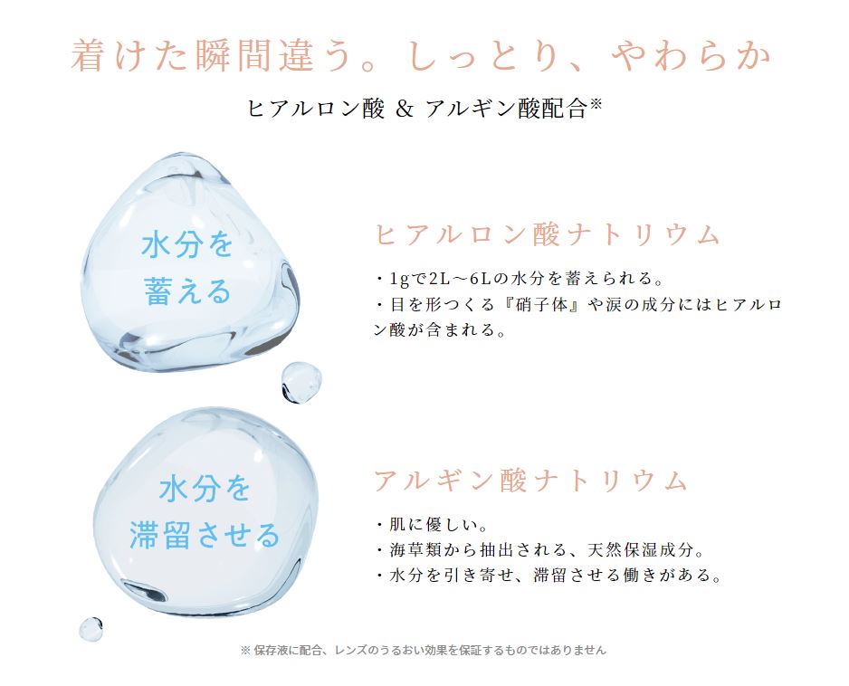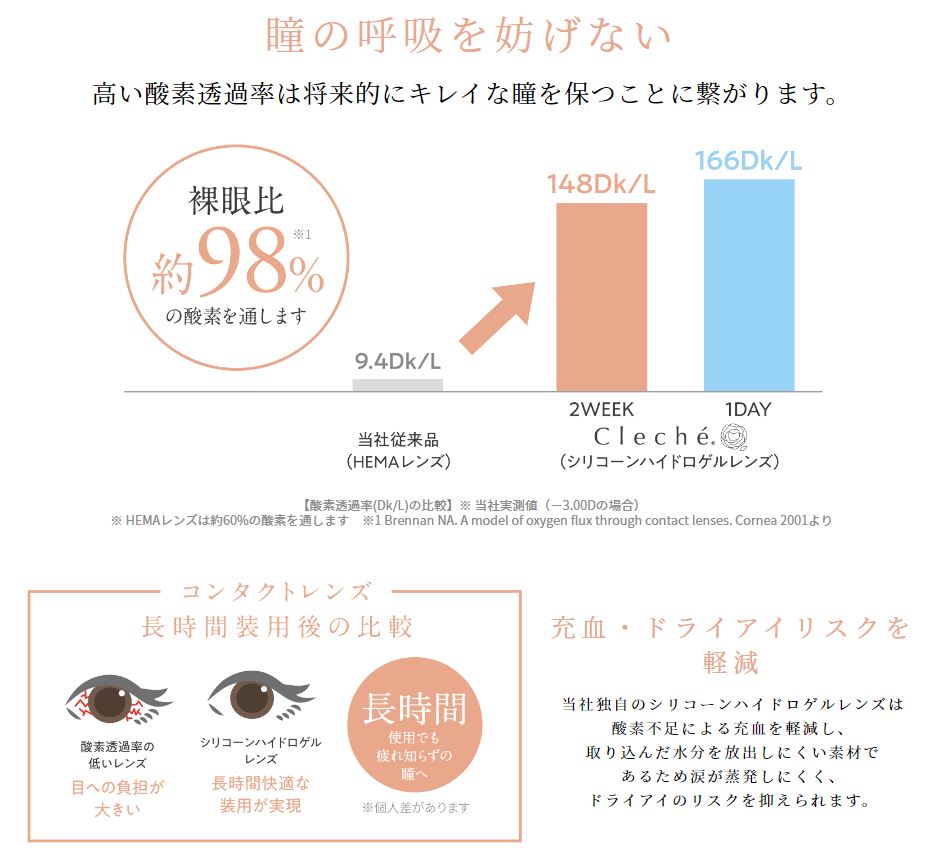 新世代のシリコーンハイドロゲル素材を採用。 目の健康に大切な酸素をより多く届け、充血を軽減することで美しい白目を保ちます。