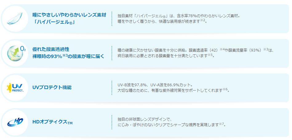 独自素材「ハイパージェル®」は、含水率78%のやわらかいレンズ素材。